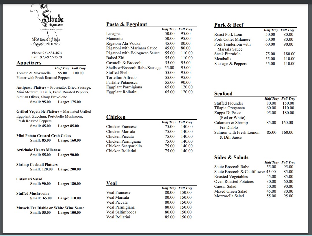 La Strada Restaurant - Randolph offers a delightful Italian dining experience in a charming setting. Located in Randolph, NJ, this restaurant showcases a menu that celebrates traditional cuisine while also emphasizing quality ingredients. Start your meal with the Caprese Salad or indulge in the refreshing Shrimp Cocktail, both perfect appetizers to whet your appetite.